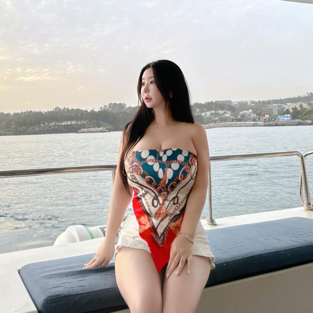 当她穿上泳装时,那种视觉效果更是炸裂。雪白嫩肤在夜色或灯光下反射的那种柔亮,让她看起来像自带滤镜一样。泳池边一靠,胸型撑到快溢出来,加上若隐若现的锁骨,整个人像是“韩国巨乳诱惑”的活体展示。